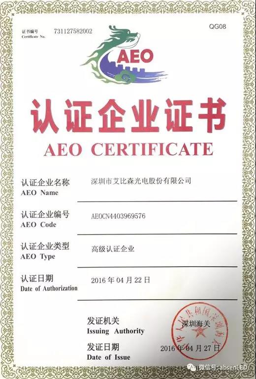 2015年艾比森獲得了深圳海關(guān)協(xié)調(diào)員企業(yè)和中國外貿(mào)出口先導指數(shù)(ELI)樣本企業(yè)等殊榮。2016年4月27日,艾比森正式成為了行業(yè)首家AEO高級認證企業(yè)。