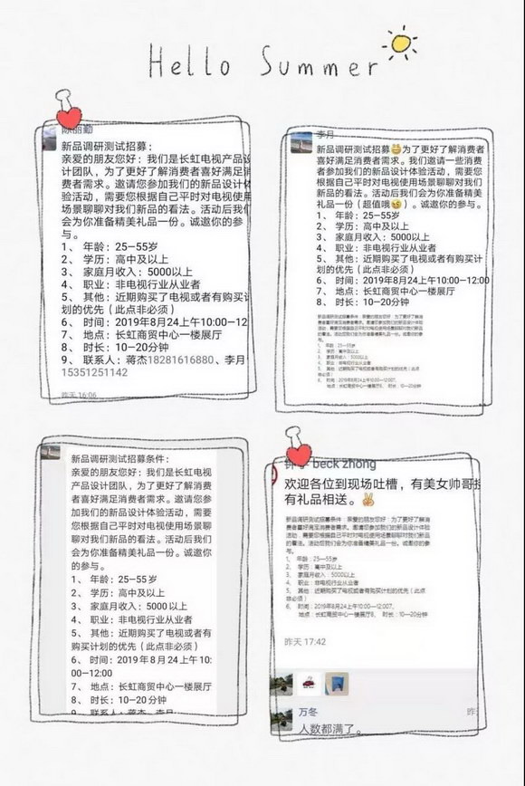接到用戶招募信息,多媒體研發(fā)中心結構所、平板所、電視部等部門積極響應和支持。招募信息僅發(fā)出去三小時后,就收到60多位符合條件的用戶的報名信息,很多員工親屬和朋友本著內(nèi)心的聲音(長虹更好)均躍躍欲試,希望能為新品設計貢獻一份力量,更盼望下一代產(chǎn)品的星光閃耀。