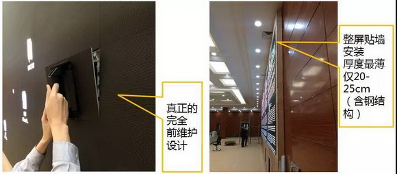 充分考慮到用戶室內(nèi)使用時對維護空間需求,臺達小間距LED采用真正的前維護安裝設(shè)計,此項設(shè)計明顯有別于市場上的“模塊前維護設(shè)計”,不僅顯示模組可以進行屏前安裝、維護,甚至包括顯示箱體內(nèi)部的控制系統(tǒng)、電源系統(tǒng)等所有零部件都完全實現(xiàn)了屏前維護。只需通過精準的磁吸式維護工具進行拆卸維護,操作簡單易控,無需預留維護空間。無需背部專門的維護通道,為用戶節(jié)約了大量空間,也從實際上體現(xiàn)了小間距LED產(chǎn)品超薄貼墻壁掛的設(shè)計意義。