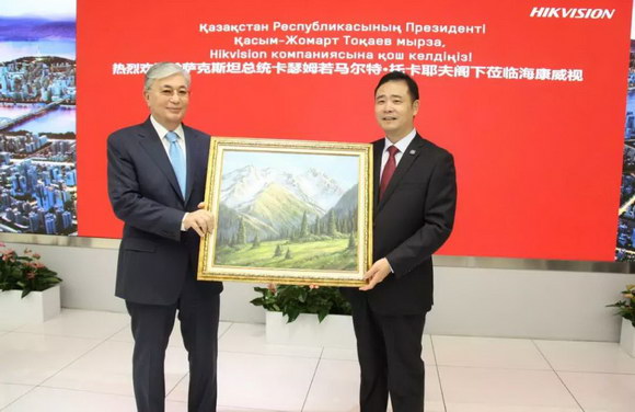 上圖:托卡耶夫總統(tǒng)一行參觀海康威視智能產(chǎn)品與應(yīng)用