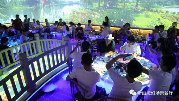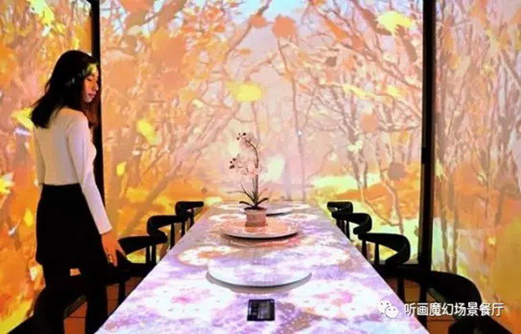 眾所周知,在就餐過程中,餐廳環(huán)境還會影響到用餐體驗,從而影響顧客對餐廳的整體評價。從這個意義上講,餐廳環(huán)境會影響到餐廳的經(jīng)濟效益。所以很多餐飲人直接將餐廳打造成能吸引消費者目光的樣子,但是市場上靠裝修風格取勝的餐飲廳太多太多,不能盡可能滿足所有人的審美與要求。而聽畫這家餐廳靠著7D全息技術(shù)實現(xiàn)了無裝修也能隨意轉(zhuǎn)換風格,對于餐飲人來說,無疑是“雪中送炭”。