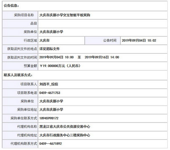 大慶市慶新小學(xué)交互智能平板采購招標(biāo)公告