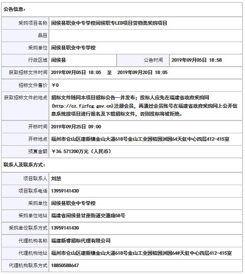 閩侯縣閩侯職專LED項(xiàng)目貨物類采購項(xiàng)目