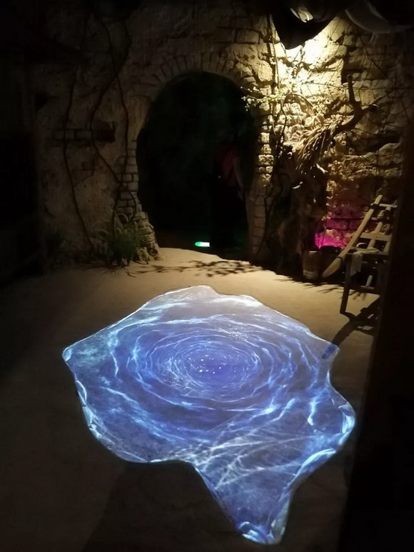 構(gòu)思巧妙的地面互動投影,當(dāng)你上一秒還沉浸在大話世界的情懷中時(shí),下一秒地面就有骷髏突然冒出,化身一個(gè)大話西游主題的“鬼屋”。在不斷遞進(jìn)的情緒感受中,把對電影經(jīng)典IP的浸入式體驗(yàn)推至最高潮。