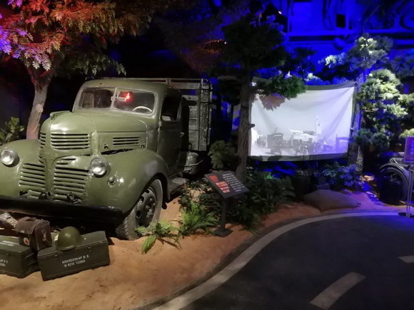 電影老爺車博物館中,搭配“公路”型走道,以電影中使用過的服裝、道具與軍用裝備為每一輛車搭建拍攝場景。電影場景的投影播放,喚醒人們的時(shí)代記憶。