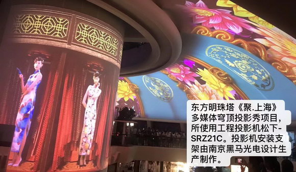 本次以東方明珠塔零米大廳穹頂為載體的IP元年首秀——《聚·上海》多媒體穹頂投影秀,其自主研發(fā)的5款可愛的IP形象:東東、方方、明明、珠珠、塔塔,出現(xiàn)在投影秀上,上演了一場(chǎng)穿越時(shí)空、城市歷險(xiǎn)等驚險(xiǎn)刺激的視覺之旅。零米大廳巨大的環(huán)形穹頂內(nèi)壁上含有棱紋,整個(gè)投影空間為雙層結(jié)構(gòu)。為打造這場(chǎng)極具創(chuàng)造性與臨場(chǎng)感的穹頂投影秀,制作團(tuán)隊(duì)通過30臺(tái)超高清大流明投影機(jī)和定制化集成的多媒體服務(wù)器系統(tǒng),呈現(xiàn)這場(chǎng)總投射面積達(dá)2200㎡的高科技華麗秀演。此次2019年上海東方明珠塔《聚.上!范嗝襟w穹頂投影秀項(xiàng)目,均使用松下工程投影機(jī)SRZ21C,而投影機(jī)安裝支架均由南京黑馬光電設(shè)計(jì)生產(chǎn)制作。