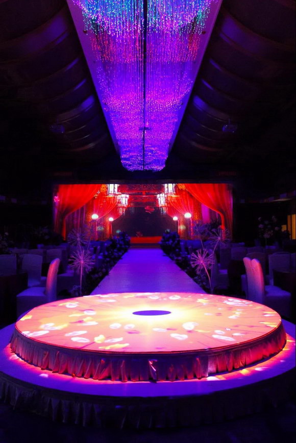 舞臺(tái)對(duì)面是一個(gè)直徑3米的公主臺(tái),該公主臺(tái)采用一臺(tái)NEC PA903X+(NP13ZL鏡頭)以垂直豎向投射方式打造。點(diǎn)亮投影機(jī),公主臺(tái)即刻變成一個(gè)多彩的大圓盤,當(dāng)新娘穿著潔白的婚紗置身公主臺(tái),潔白的婚紗如施了魔法般即刻呈現(xiàn)出鮮花、火焰、星光等圖案,瞬間成為全場(chǎng)的焦點(diǎn)。