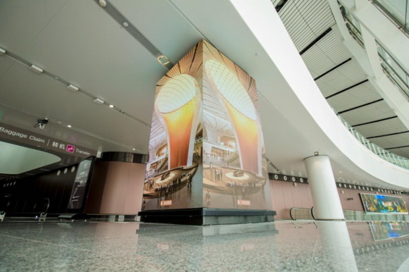 另二個(gè)四面環(huán)繞的LED包柱屏位于機(jī)場主干道,天然獨(dú)特視覺,強(qiáng)勢吸睛,90度直角無縫拼接工藝,播放內(nèi)容可360度無死角輻射來往人群,極具創(chuàng)意的形式為展示內(nèi)容賦予震撼力量。