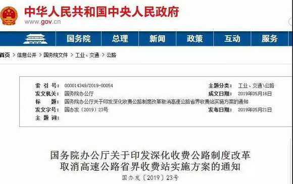 2019年5月21日,國務院辦公廳印發(fā)深化收費公路制度改革,取消高速公路省界收費站實施方案的通知(國辦發(fā)〔2019〕23號),力爭2019年底前基本取消全國高速公路省界收費站。