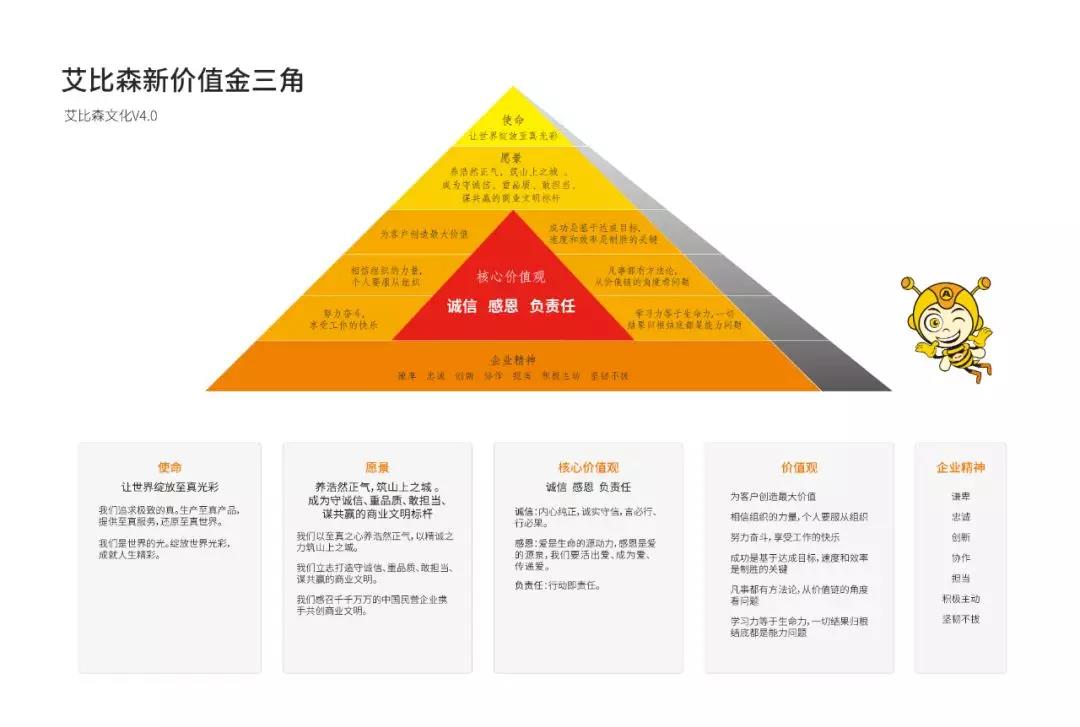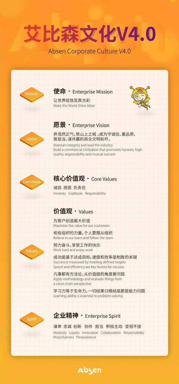 從這一刻起,“讓世界綻放至真光彩”是艾比森新的使命;“養(yǎng)浩然正氣,筑山上之城。成為守誠信、重品質(zhì)、敢擔(dān)當(dāng)、謀共贏的商業(yè)文明標(biāo)桿”是艾比森新的愿景;“誠信、感恩、負(fù)責(zé)任”是艾比森人堅(jiān)守不渝的核心價(jià)值觀;“為客戶創(chuàng)造最大價(jià)值;相信組織的力量,個(gè)人要服從組織;努力奮斗,享受工作的快樂;成功是基于達(dá)成目標(biāo),速度和效率是制勝的關(guān)鍵;凡事都有方法論,從價(jià)值鏈的角度看問題;學(xué)習(xí)力等于生命力,一切結(jié)果歸根結(jié)底都是能力問題”是指導(dǎo)艾比森人處理工作中各種紛繁復(fù)雜問題的價(jià)值觀與方法論;“謙卑、忠誠、創(chuàng)新、協(xié)作、擔(dān)當(dāng)、積極主動(dòng)、堅(jiān)韌不拔”是每一個(gè)艾比森人必須具備的精氣神,凝聚成艾比森的企業(yè)精神。