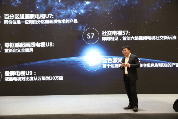 王偉用了“創(chuàng)造”這個詞來概括海信視像的2019,這一年,海信電視連續(xù)打造爆款,向市場推出了多款現象級產品:同價位唯一應用百分區(qū)高畫質技術的U7、重新定義全面屏的U8、首創(chuàng)六重防殘影技術的OLED電視A8,對比度從萬級到10萬級的疊屏電視U9、首創(chuàng)六路視頻電視新玩法的社交電視S7,以及首個達到BT2020未來電視色彩標準的全色激光電視L9。