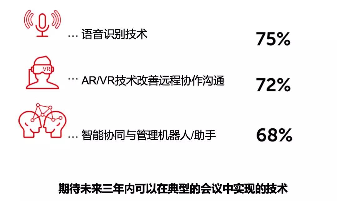 根據(jù)調(diào)查顯示,有80%的受訪者希望在未來兩年內(nèi),可以看到有新的會(huì)議技術(shù)應(yīng)用。事實(shí)上,技術(shù)在會(huì)議辦公中的發(fā)展將主要聚焦三個(gè)方向: