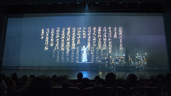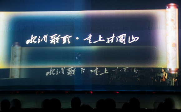 整場演出突破以往傳統(tǒng)劇目創(chuàng)作手法,緊跟時代,推陳出新,運用蘇州評話和蘇州評彈結(jié)合交響樂隊,使用全新舞美、全息投影的藝術(shù)形式來貫穿舞臺,特別是全息投影將毛體書法呈現(xiàn)在空氣幕布,洋洋灑灑,氣勢非凡,美輪美奐。傳統(tǒng)評彈與西洋音樂的結(jié)合不僅給觀眾帶來視、聽的美好感受,也在評彈與現(xiàn)代舞臺的結(jié)合方面做了創(chuàng)新實踐,使得年輕人能夠喜歡并接力綻放評彈藝術(shù)。