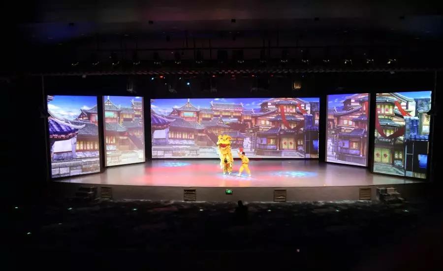 項(xiàng)目設(shè)計(jì)之初考慮以LED屏做為顯示,但考慮到有會議需求功能,長時(shí)間會議時(shí)屏亮度過高,會造成人眼高度視覺疲勞。考慮需要兼顧會議和演出的使用,最后采用了Canon LX-MU800Z激光投影機(jī),其功能和亮度完全滿足演出和會議的需求。面對投影距離不同造成的困難,實(shí)際設(shè)計(jì)中綜合運(yùn)用了背投+短焦,正投技術(shù),保證全屏亮度一致性。經(jīng)實(shí)際會議和演出的檢驗(yàn),Canon投影機(jī)在使用過程中,色彩和亮度都得到了一致好評。