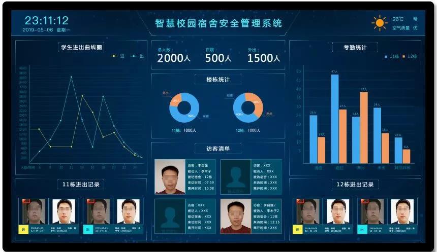 數(shù)據(jù)收集后,信息將會通過設(shè)置在校園中的大華宿舍信息發(fā)布屏實(shí)時發(fā)布,讓宿管和同學(xué)們都可以清楚獲悉目前的宿舍人員的出入狀況、請假信息等,做到信息透明、公正。同時,訪客信息也將躍然屏上,令宿舍生活、親友探訪、電器維修、事件追溯等更加快捷、方便。