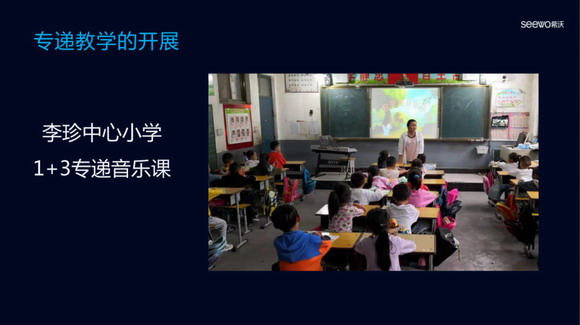 朱主任接著分享:“起初,我們擔(dān)心山區(qū)網(wǎng)速無法支持實現(xiàn)這一想法,但是希沃產(chǎn)品最低只要求上行4M即可使用,這很好地保證了專遞課堂穩(wěn)定傳輸,做到不延遲。我區(qū)通過課表排課的功能,將教學(xué)點開不齊的音樂、美術(shù)、英語課與中心小學(xué)排在同一時間。在中心小學(xué)老師授課時,教學(xué)點教室里只要打開希沃錄播主機連接互動,就可以和中心小學(xué)同上一節(jié)課。一個中心小學(xué)的老師既可以帶著本教室的學(xué)生,也可以同時帶著幾個教學(xué)點的學(xué)生同步上課,完全沒有影響中心小學(xué)的正常上課節(jié)奏。通過這種互動上課的形式,在課堂上中心校師生與教學(xué)點學(xué)生互動交流,不僅讓教學(xué)點開齊了課,也讓在遠程課堂兩端的學(xué)生成了同學(xué),交起了朋友!