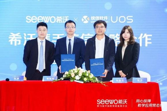 10月23日,第78屆中國(guó)教育裝備展盛大開幕儀式之后,希沃與統(tǒng)信軟件的戰(zhàn)略合作簽約儀式拉開了序幕,希沃副總裁黃逸濤、希沃多媒體事業(yè)部副總經(jīng)理張凌、統(tǒng)信高級(jí)副總經(jīng)理朱建忠、統(tǒng)信商務(wù)總監(jiān)郭芬均出席了簽約儀式。這次合作,我們的目標(biāo)是打造自主可控的教學(xué)應(yīng)用和系統(tǒng),在教育領(lǐng)域?yàn)槿珖?guó)師生提供“易用”、“好用”的產(chǎn)品和服務(wù),為中國(guó)的教育信息化開啟新的篇章。