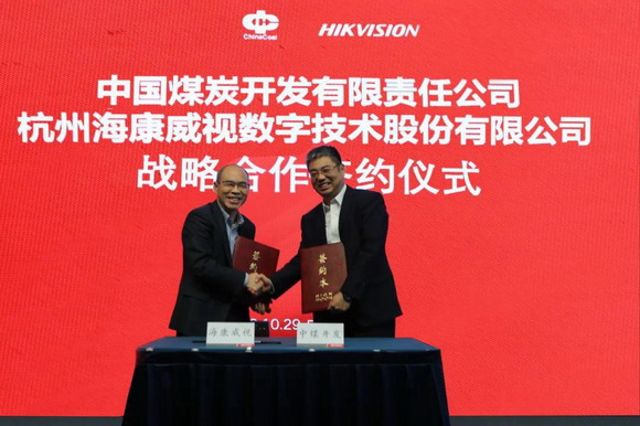 會上,中國煤炭開發(fā)有限責任公司(以下簡稱:開發(fā)公司)與杭州?低晹(shù)字技術(shù)股份有限公司(以下簡稱:?低暎┡e行戰(zhàn)略合作簽約儀式,開發(fā)公司執(zhí)行董事、黨委書記、總經(jīng)理劉國勝與?低暱偛煤鷵P忠代表雙方簽署戰(zhàn)略合作框架協(xié)議。