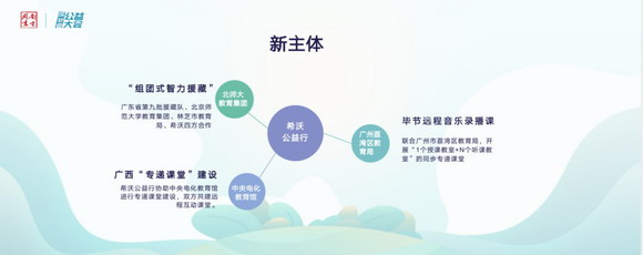 最后,“希沃公益行”在主體上也有所創(chuàng)新。2020年,“希沃公益行”通過(guò)構(gòu)建教育精準(zhǔn)幫扶中多主體多途徑協(xié)同發(fā)展機(jī)制,聯(lián)合中央電化教育館、北京師范大學(xué)教育集團(tuán)、荔灣區(qū)教育局等社會(huì)各方共同做公益,從單個(gè)企業(yè)“搭臺(tái)唱戲”變?yōu)榇罱ㄆ脚_(tái)、匯聚各方資源,給需要幫助的區(qū)域帶去真正的、看得見(jiàn)的成長(zhǎng)和幫助。