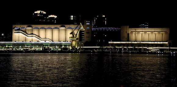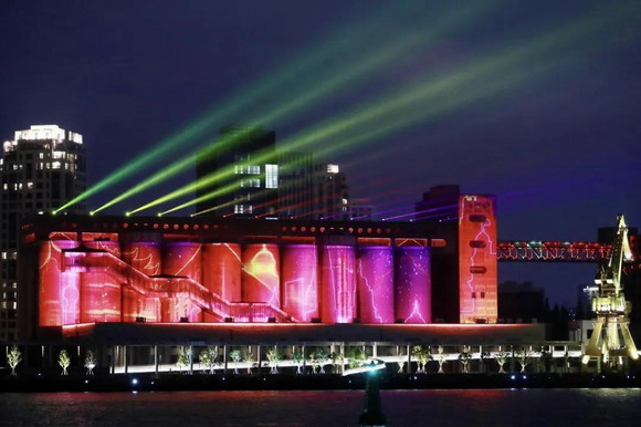 作為歷史車輪滾滾輾過(guò)所遺留的痕跡,昔日的糧倉(cāng)已卸下了守護(hù)一方溫飽的重任,但烜赫一時(shí)的糧倉(cāng)并未退出歷史的舞臺(tái)。如今的八萬(wàn)噸筒倉(cāng)已逐漸褪去工業(yè)社會(huì)氣息,成功轉(zhuǎn)型藝術(shù)展場(chǎng),成為光影秀的載體。