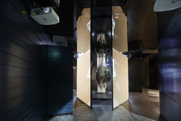 該展項(xiàng)采用八臺(tái)Vivitek(麗訊)DU5671投影機(jī),4臺(tái)用于覆蓋地面14.3*3米的畫面,2臺(tái)用于投門5*3米畫面,2臺(tái)用于投地面4*4.8米,當(dāng)人們漫步于城市數(shù)據(jù)的時(shí)間流中,搭配雷達(dá)感應(yīng)器實(shí)時(shí)反饋位置,從而讓人們可以影響并參與到這股洪流中,在充滿神圣儀式感的氛圍下走向無盡可能的“未來”。