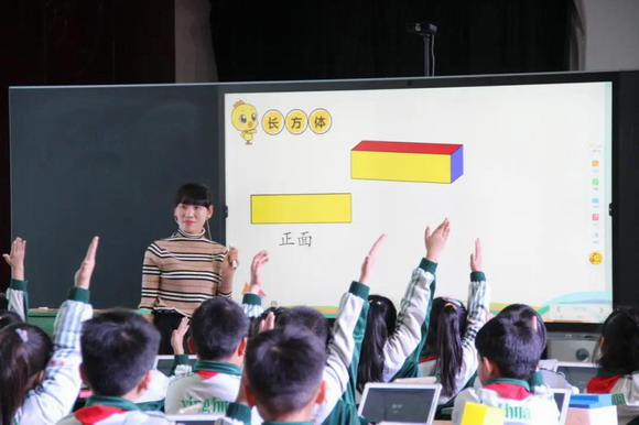 二年級的侯叔娟老師向與會嘉賓們展現(xiàn)了一堂生動有趣的數(shù)學課《觀察物體》。侯老師在教學過程中結(jié)合希沃易課堂課件推送、截屏推送等功能,讓學生在平板上按立體圖形的特征進行分類,通過實時互動,加強了學生們的參與感和專注度。