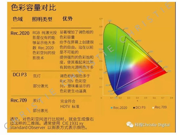 每種照明技術匹配不同的色域,RGB 純激光照明是最接近顯示全部 Rec.2020 色域的照明技術。