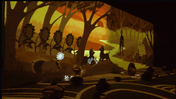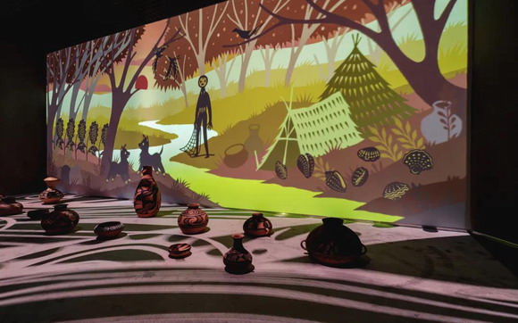 《圖騰密碼》展項(xiàng)采用6臺(tái)Vivitek(麗訊)RU70983工程投影機(jī),獨(dú)創(chuàng)寫意的遠(yuǎn)古動(dòng)畫影像從墻面覆蓋至地面,生動(dòng)還原5000年前的上古生活場(chǎng)景。而在場(chǎng)景之中,放置著形態(tài)各異的大小彩陶瓶,最為矚目的當(dāng)屬人頭型器口彩陶瓶,以人頭像及抽象的線條結(jié)合,詩(shī)意的詮釋中華文明最為古老的彩陶文化。