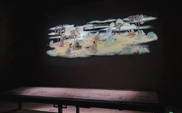 利用獨(dú)特設(shè)計(jì)的立體拼圖裝置,觀眾通過(guò)讓磚塊復(fù)位的形式,點(diǎn)亮八位賢士的動(dòng)態(tài)影像,以此引導(dǎo)觀眾在親身參與中直觀體會(huì)磚畫的構(gòu)造形式和制作工藝,同時(shí)感受東方語(yǔ)境里的生命節(jié)序。