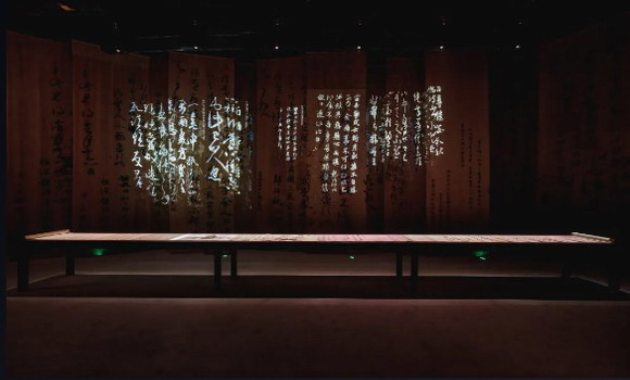 《萬(wàn)歲通天帖》作為唯一接近書圣王羲之真跡的書法珍品,有著極其珍貴的文獻(xiàn)研究?jī)r(jià)值。展項(xiàng)內(nèi)共使用2臺(tái)Vivitek(麗訊) RU70983和6臺(tái)DH3660Z工程投影機(jī)打造而成,空間紗幕呈現(xiàn)動(dòng)態(tài)書寫的書信文字,中間區(qū)域的條形長(zhǎng)案同樣以影像與之呼應(yīng),使觀眾在欣賞大師真跡的同時(shí),也能感受作品背后的奇聞異事,體會(huì)中華傳統(tǒng)書畫藝術(shù)的獨(dú)特魅力。