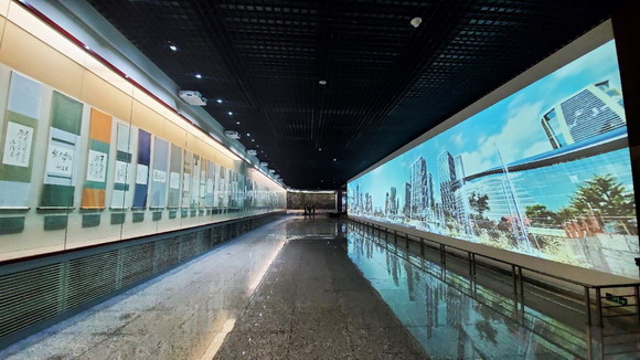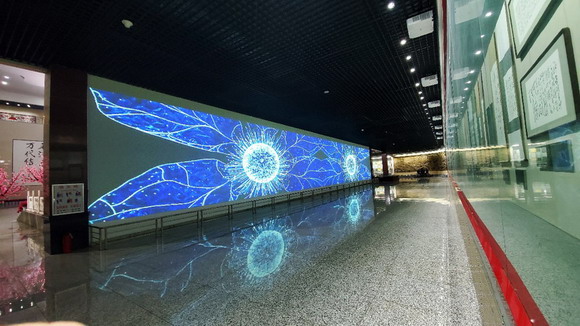巨幕對面陳列著靜態(tài)櫥窗,將動(dòng)態(tài)詩詞與靜態(tài)書畫構(gòu)成一個(gè)整體。為了能夠觀看清楚每部作品的細(xì)節(jié),展廳天花板設(shè)有數(shù)量較多的筒燈?紤]到館內(nèi)強(qiáng)光將影響投影效果的這一因素,哈勃PA1004UL-W+ 液晶激光投影機(jī)1萬流明的高亮度,對明亮度和超寬屏畫面效果來說是一個(gè)更好的選擇。