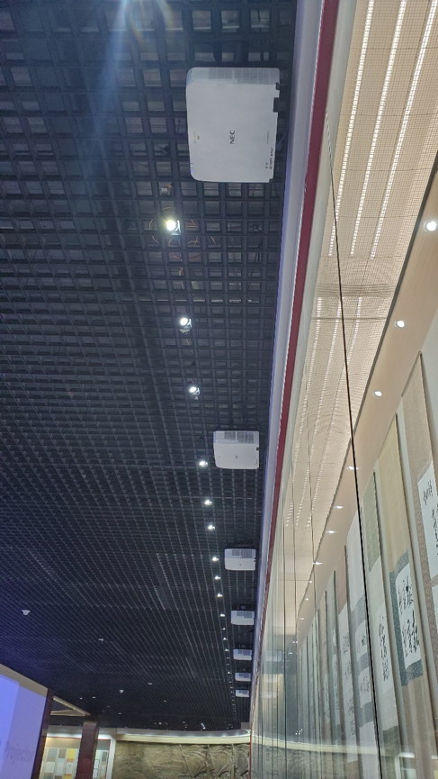 7臺投影機(jī)沿博物館天花板鋁格柵一側(cè)依次吊裝開來,白色簡潔機(jī)身與博物館空間裝飾相稱。并且,PA1004UL-W+ 機(jī)身緊湊小巧,重量約24KG,適合搬運(yùn)和吊裝。該項(xiàng)目中,7臺哈勃系列投影機(jī)均搭配短焦鏡頭,在不足6米的投射距離條件下,每臺投影機(jī)也能實(shí)現(xiàn)寬度約為5米的大尺寸投影畫面,滿足了近距離投射大畫面的需求。