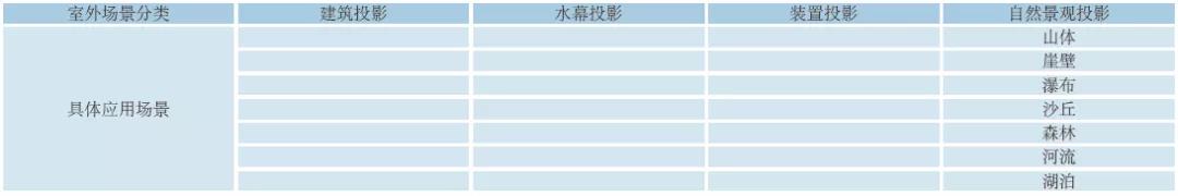 投影顯示的應(yīng)用場(chǎng)所非常廣泛,室內(nèi)、室外都有應(yīng)用,具體的應(yīng)用場(chǎng)景如表1、表2所示。因不同的應(yīng)用場(chǎng)所和功能需求,有不同的照明環(huán)境、不同的使用特點(diǎn)、不同的信號(hào)特征。特別是夜晚,環(huán)境光可控,投影介質(zhì)復(fù)雜多樣、不可控、不一致,投影設(shè)備使用環(huán)境較差,動(dòng)態(tài)視頻為主,基本上都屬于projection mapping范疇。因此,要根據(jù)各自獨(dú)特的需求進(jìn)行細(xì)分,才能做好。例如會(huì)議室,屬于安裝環(huán)境很好但照度比較高的場(chǎng)所,所以可以選擇商務(wù)類(lèi)機(jī)型;而室外夜游,投影機(jī)安裝環(huán)境很差,則必須選擇工程類(lèi)機(jī)型。
