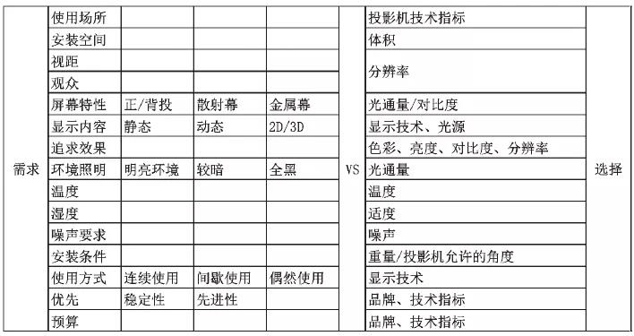 在充分理解投影機(jī)技術(shù)參數(shù)物理意義的基礎(chǔ)上,選擇投影機(jī)的過(guò)程就是在需求和投影機(jī)指標(biāo)之間尋求匹配,可以參照?qǐng)D3進(jìn)行。