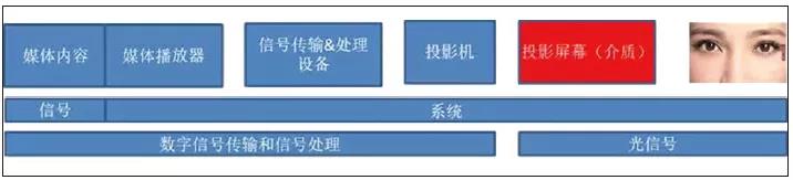 掌握投影機(jī)性能是基礎(chǔ),設(shè)計(jì)并使用好投影顯示系統(tǒng)才是目的。圖4是一個(gè)典型投影顯示系統(tǒng)的構(gòu)成,從中可以看出,一個(gè)投影顯示系統(tǒng)包括顯示內(nèi)容、顯示內(nèi)容用的播放器,信號(hào)傳輸器材、投影機(jī)和投影介質(zhì)以及觀眾。這里特別需要說(shuō)明的是觀眾,實(shí)際上觀眾的眼睛是顯示系統(tǒng)的一部分,只有讓觀眾看得見(jiàn)、看得清、看得舒適才能稱(chēng)之為一個(gè)設(shè)計(jì)成功的投影顯示系統(tǒng)(項(xiàng)目),也才可以說(shuō)用好投影機(jī)了。