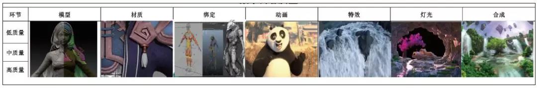 如果播放的媒體質(zhì)量不好,再好的投影系統(tǒng)也無(wú)法呈現(xiàn)好的效果,所以,必須保證媒體的質(zhì)量。但值得注意的是,媒體本身也是存在質(zhì)量差異的,例如采用CG(Computer Graphics)制作的數(shù)字媒體有很多的環(huán)節(jié),如圖6所示,不同環(huán)節(jié)質(zhì)量的把握就會(huì)形成不同質(zhì)量的顯示效果。