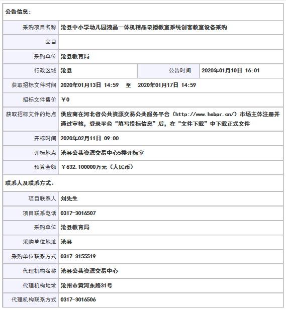 采購(gòu)項(xiàng)目名稱: 滄縣中小學(xué)幼兒園液晶一體機(jī)精品錄播教室系統(tǒng)創(chuàng)客教室設(shè)備采購(gòu)