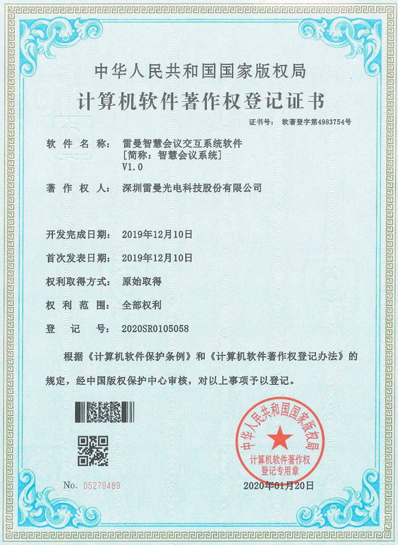 近日,深圳雷曼光電科技股份有限公司自主研發(fā)的“雷曼智慧會議交互系統(tǒng)軟件V1.0”產(chǎn)品順利通過國家版權(quán)局中國版權(quán)保護中心的嚴格審查,正式獲得了由國家版權(quán)局核發(fā)的《計算機軟件著作權(quán)登記證書》(以下簡稱軟著)。