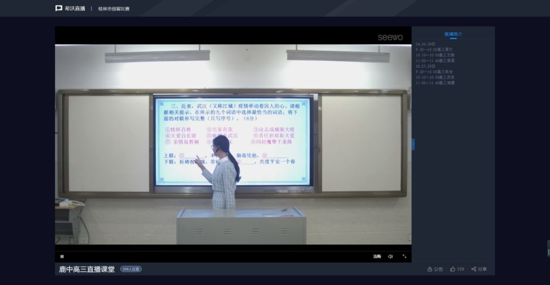 據(jù)悉,鹿寨中學(xué)初步預(yù)計(jì)開展30節(jié)直播課,截止3月4日,共計(jì)約5000人次學(xué)生參與直播課堂,單堂課最多觀看人數(shù)達(dá)832人。鹿寨中學(xué)藍(lán)校長表示,疫情期間,學(xué)校高考備考小組不畏艱難,不斷商討最優(yōu)的教學(xué)安排,與希沃公司反復(fù)溝通直播錄播細(xì)節(jié),孜孜不倦地在線上為高三學(xué)子答疑解惑,希望通過此次希沃直播課堂,給學(xué)生帶來信心,無懼疫情共逆行,沖刺百日換新天。