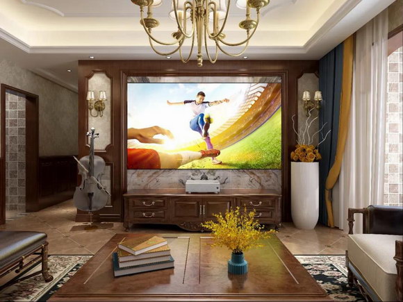 想象一下,忙碌一天,回到家里,客廳柔暖的黃色光亮起,一家人坐在地毯上,看100英寸甚至120英寸的巨幕電影,激光電視簡潔美麗的身影靜靜地留在光影間,不打擾,但也不可或缺。