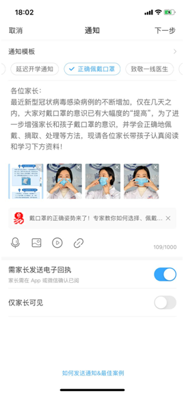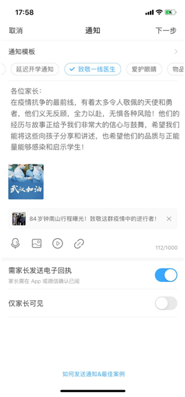 抵御疫情,通知及時性顯得尤為重要。班優(yōu)為老師提供了關(guān)于此次新型肺炎的通知模版,老師只需輕編輯,上傳所需圖片、視頻,就可以向家長、學(xué)生科普疫情知識,傳遞正能量。