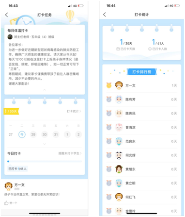 PS:家長每天在后臺完成打卡后,無需老師爬樓登記,系統(tǒng)可自動統(tǒng)計(jì)打卡情況,本班學(xué)生身體情況一目了然,以便老師開展下一步的防控措施。