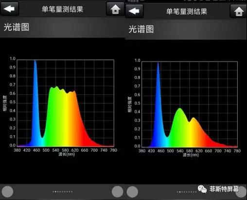 光譜圖可以直觀的表明顯示設備的發(fā)光情況,其中橫坐標表示波長(頻率),縱坐標則表示相對強度,在讀圖時通過藍光的高度我們就可以確定顯示設備是否藍光過剩,同時從橫坐標我們可以讀出藍光的波長,從而判斷它對人眼的危害大小。