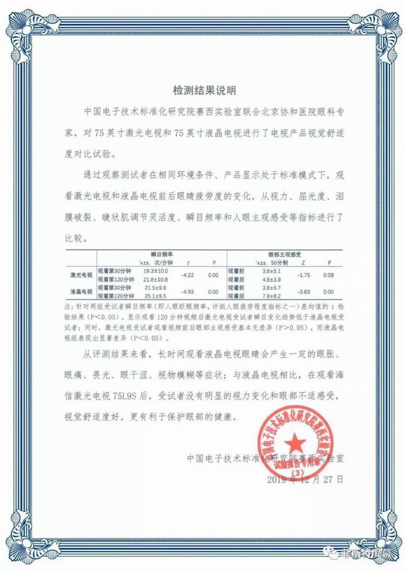 此外,中國電子技術標準化研究院賽西實驗室和北京協(xié)和醫(yī)院眼科專家通過人群相同條件下觀看激光電視和液晶電視的嚴格對比試驗,得出了144組測試數(shù)據(jù)。數(shù)據(jù)證實:激光電視的確具有很強的護眼特性,在特定方面甚至具有一定的改善作用。