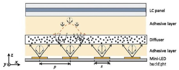 ▲Mini LED背光原理示意,與傳統(tǒng)LED背光相似。