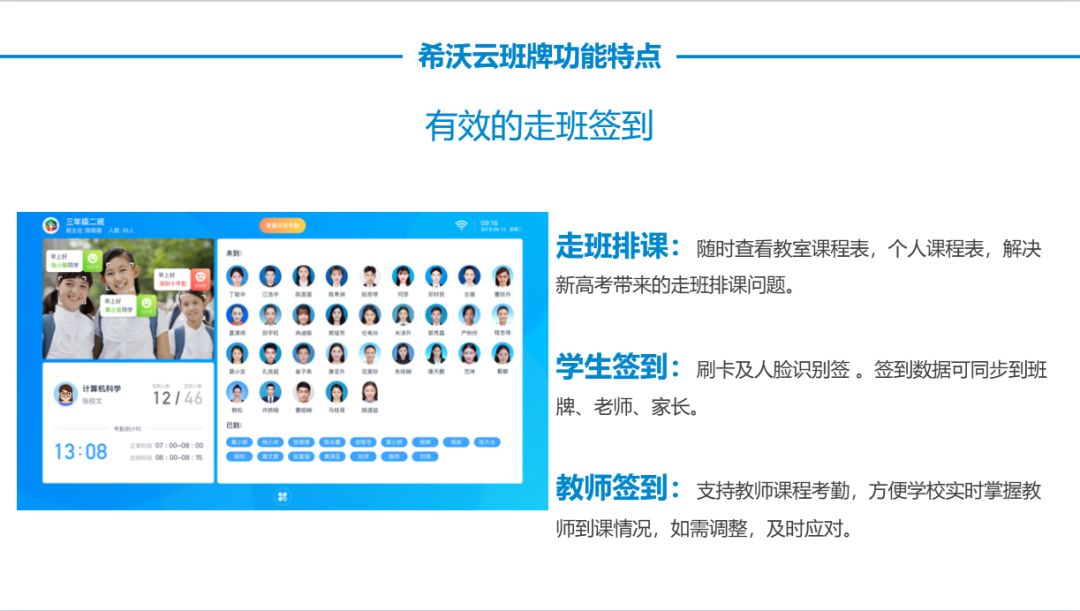 以云平臺、云服務(wù)器為基礎(chǔ),希沃云班牌豐富多彩地展示了學(xué)校信息化建設(shè)成果,實現(xiàn)學(xué)校信息的多維度呈現(xiàn)與信息化管理。