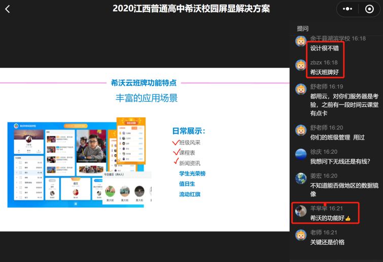為了充分利用教育信息化手段,保證江西省新高考改革順利平穩(wěn)進行,切實解決新高考啟動后高中學(xué)校普遍面臨的走班排課復(fù)雜、精準化教學(xué)不深入、教學(xué)師資不足、校園管理水平不高等突出問題,疫情期間,主題為《2020江西普通高中希沃校園屏顯解決方案》的三期培訓(xùn)在江西開展。利用希沃白板的云課堂功能,各學(xué)校領(lǐng)導(dǎo)和信息技術(shù)負責(zé)人線上參與了本次培訓(xùn)。