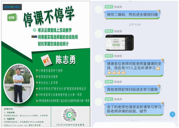 作為合江縣少岷職業(yè)教育集團(tuán)骨干教師陳志勇老師,在春節(jié)期間一刻也沒有放松過學(xué)習(xí)。在2月4日晚,陳老師對(duì)全校老師進(jìn)行“如何玩轉(zhuǎn)希沃白板的云課堂”專題培訓(xùn),深夜還在教師群里討論交流使用希沃白板的云課堂,帶領(lǐng)學(xué)校各科優(yōu)秀教師為全體學(xué)生提供在線教學(xué)、互動(dòng)答疑,學(xué)生居家學(xué)習(xí),既防控了疫情,又保證了學(xué)生的學(xué)習(xí)效果。
