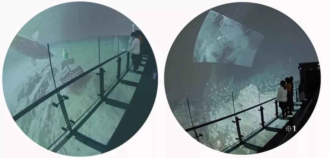 12臺(tái)松下高分辨率激光投影機(jī)實(shí)現(xiàn)了大約6K分辨率(是通常的1.5倍),高色彩還原度,360度全方位均勻而明亮的高精度圖像輸出帶來(lái)身臨其境的視覺(jué)體驗(yàn),宛如從深海探測(cè)器中向外看的沉浸式效果。