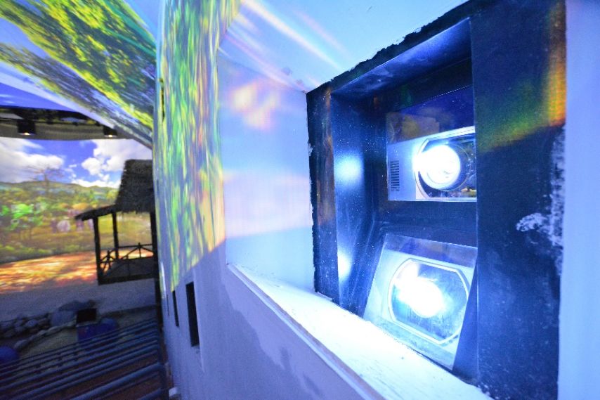 體驗(yàn)中,頭頂上方還會(huì)有雨水、煙霧噴出,配合著電閃雷鳴的光感效果。5D沉浸式體驗(yàn)館的硬核投影技術(shù),采用14臺(tái)NEC PA系列8000流明激光投影機(jī)以3D-Mapping、270°穹頂和全息空間成像技術(shù),與民族歌舞完美融合,交織成美輪美奐的熱帶海島風(fēng)情畫卷。